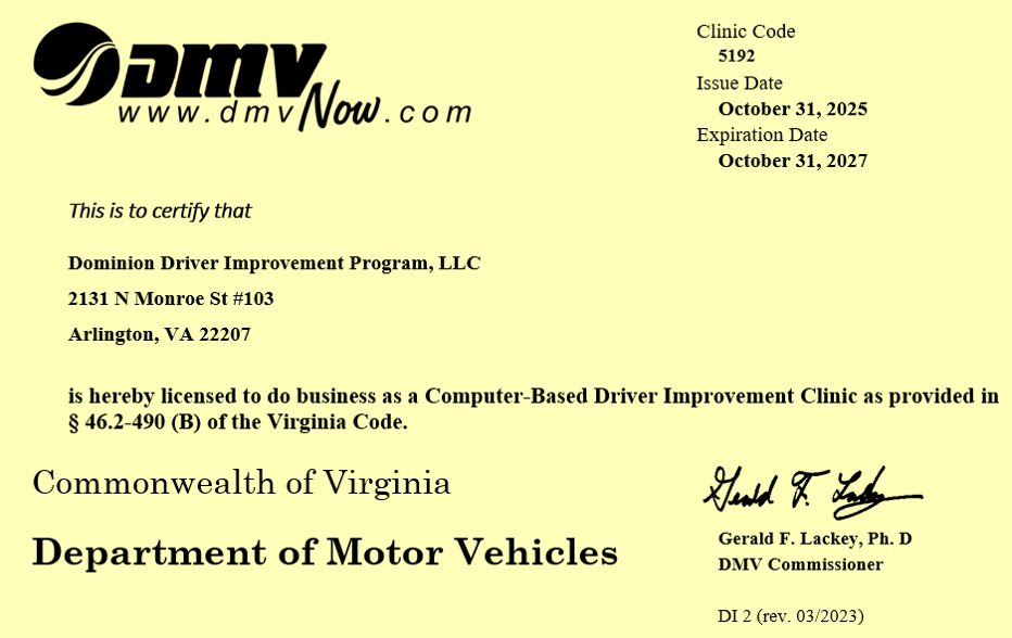 Click on the certificate below to see our DMV certificate to operate an Online Driver Improvement Clinic in Virginia.
