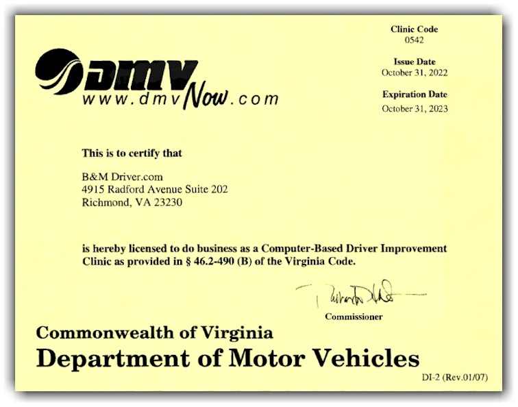 Click on the certificate below to see our DMV certificate to operate an Online Driver Improvement Clinic in Virginia.