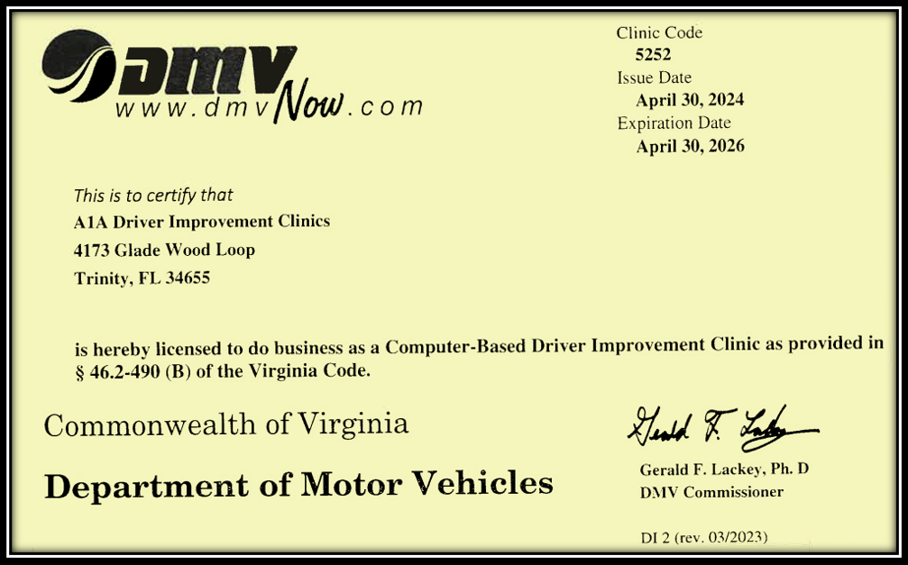 Click on the certificate below to see our DMV certificate to operate an Online Driver Improvement Clinic in Virginia.