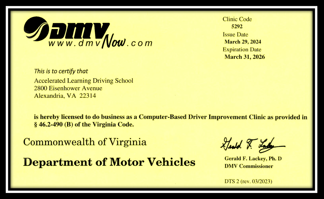 Click on the certificate below to see our DMV certificate to operate an Online Driver Improvement Clinic in Virginia.