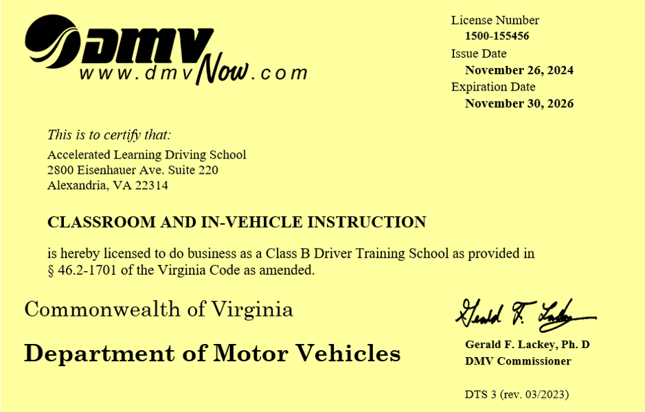 Click on the certificate below to see our DMV certificate to operate an Online Driver Training School in Virginia.