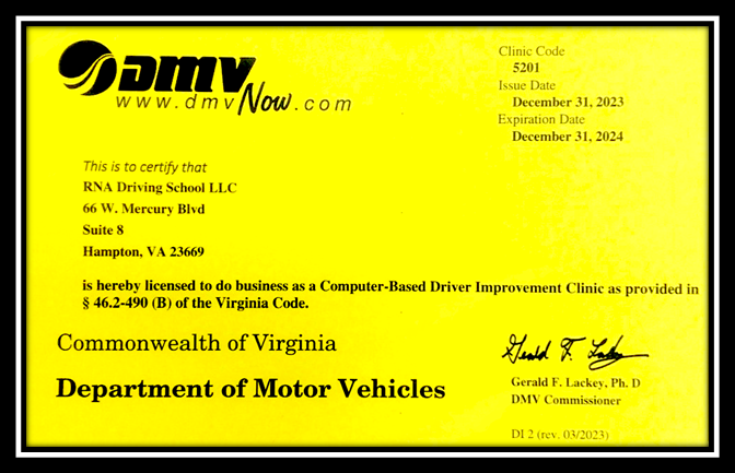 Click on the certificate below to see our DMV certificate to operate an Online Driver Improvement Clinic in Virginia.