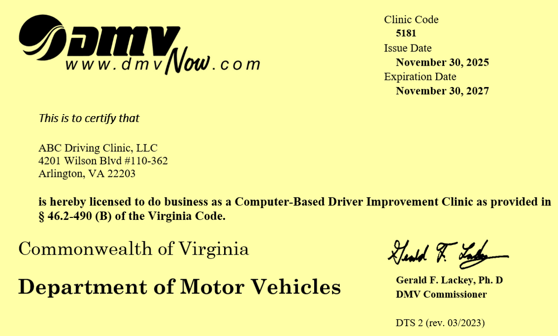 Click on the certificate below to see our DMV certificate to operate an Online Driver Improvement Clinic in Virginia.