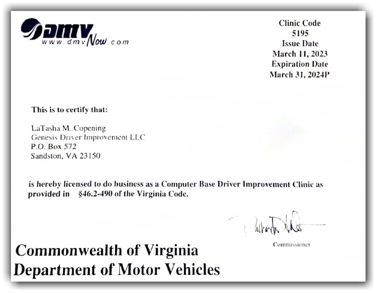 Click on the certificate below to see our DMV certificate to operate an Online Driver Improvement Clinic in Virginia.